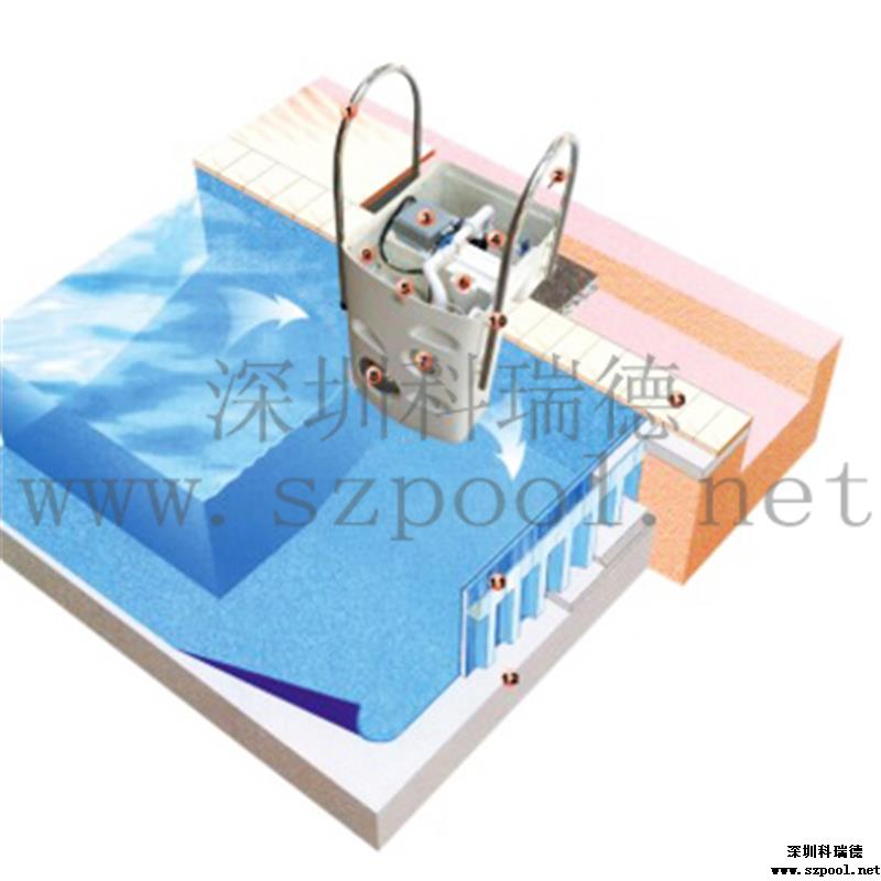 【原理】:通過電機(jī)、水泵運(yùn)轉(zhuǎn)產(chǎn)生真空負(fù)壓,把游泳池里沒有過濾的水從進(jìn)水口吸到過濾器里(界面進(jìn)水,可以處理水表面懸浮物),經(jīng)過過濾后,再通過出水口回到游泳池里,整個(gè)泳池的水形成一個(gè)大的順時(shí)針方向的立體循環(huán),該循環(huán)在泳池水體內(nèi)完成,其能量損失很小。