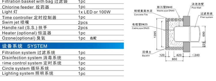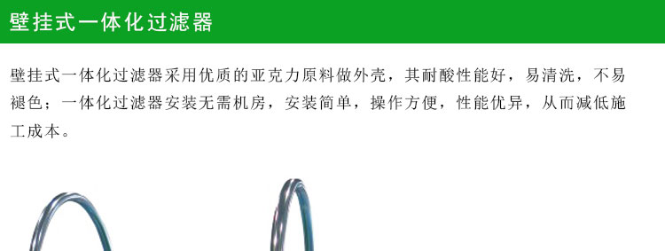 【應(yīng)用范圍】:適合小型泳池,溫泉,桑拿,按摩池等專用一體化過濾壁掛式設(shè)備。一般200立方以下,特別適合于小型私家泳池。