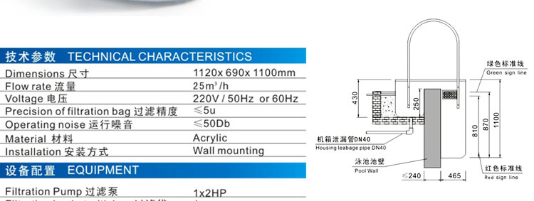 泳池壁掛式一體化過濾器采用優(yōu)質(zhì)的亞克力原料做外殼,其耐酸性能好,易清洗,不易褪色;一體化過濾器安裝無(wú)需機(jī)房,安裝簡(jiǎn)單,操作方便,性能優(yōu)異,從而減低施工成本。