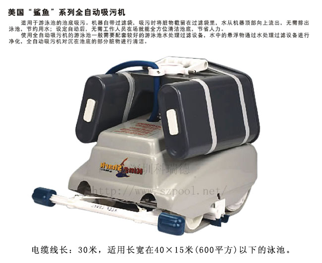 美國進(jìn)口鯊魚系列王子型全自動吸污機(jī),又叫“帝鯊”王子型商用吸污機(jī),配30米線。主要用于室內(nèi)泳池或私家泳池的池底吸污。適用于標(biāo)準(zhǔn)吸污機(jī)。
