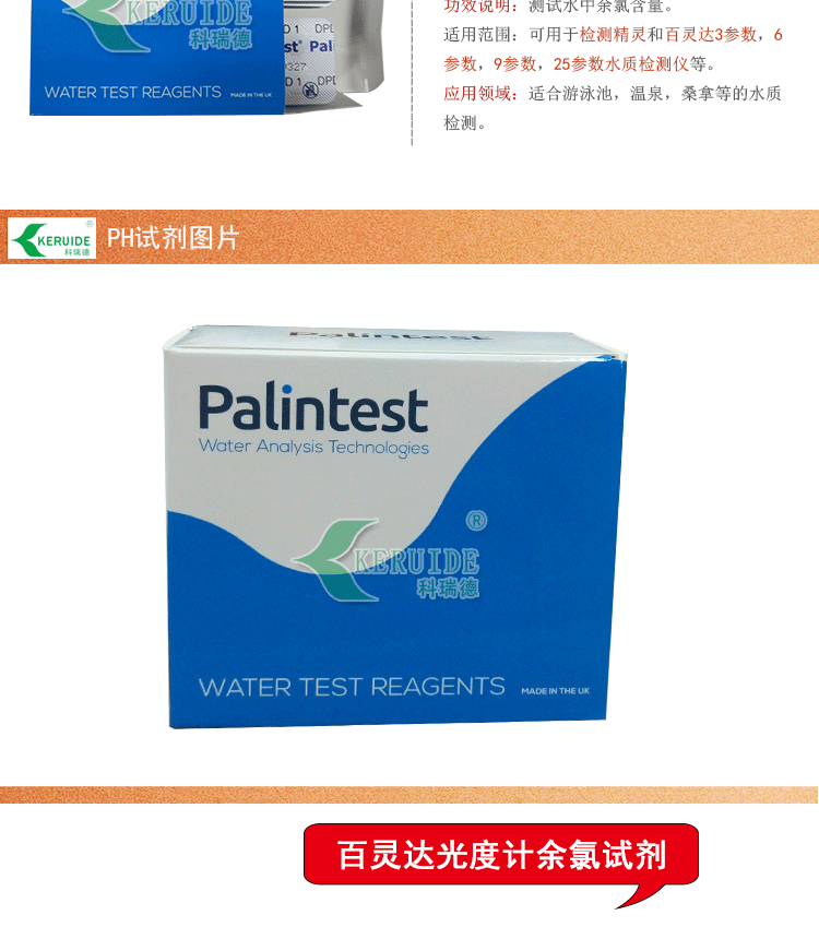 功效說明:測(cè)試水中余氯濃度和PH值。