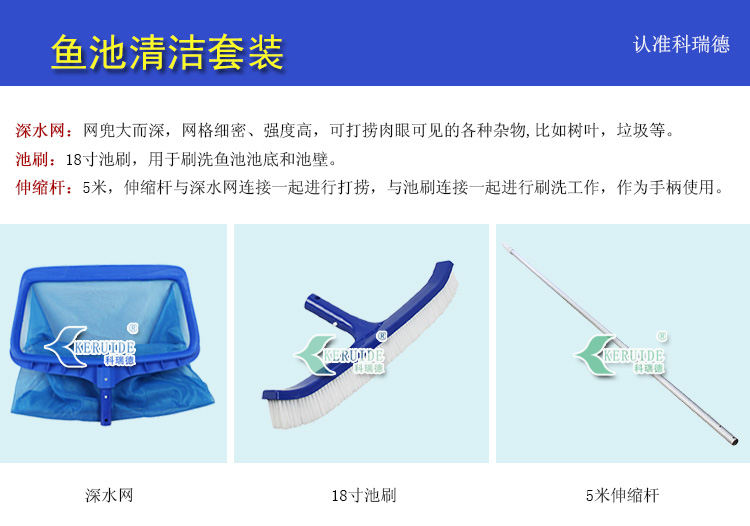 魚池清潔套裝,是一組魚池清潔工具。一共有三種,分別是魚池深水網(wǎng),18寸池刷,5米伸縮桿。三者互相配合,將魚池清理干凈。