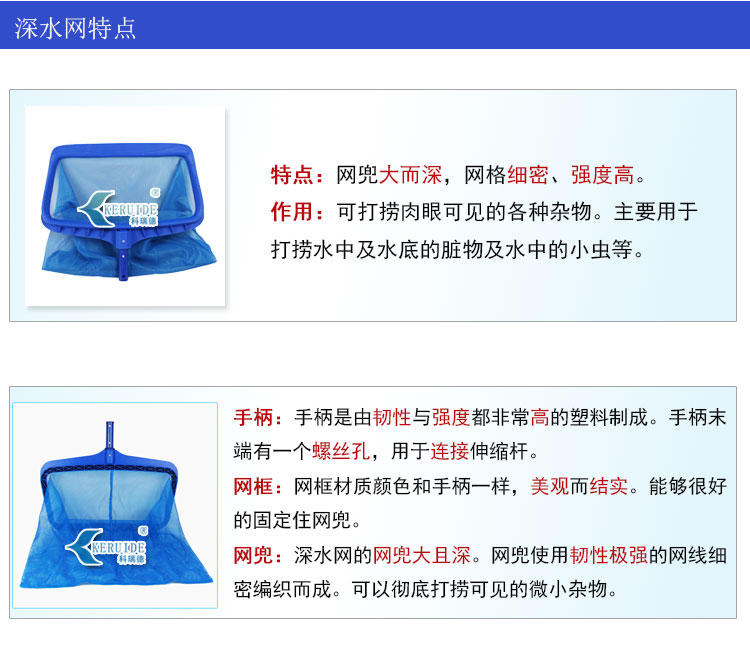 【特點(diǎn)】:魚池深水網(wǎng)的網(wǎng)兜大而深,網(wǎng)格細(xì)密、強(qiáng)度高,可打撈肉眼可見的各種雜物。主要用于打撈水中及水底的臟物及水中的小蟲等。