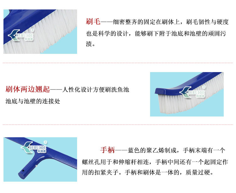 【材質(zhì)】:魚池刷子顏色為藍(lán)色,材質(zhì)為高密度聚乙烯,刷子手柄末端有一個(gè)螺絲孔用于和伸縮桿相連,手柄中間還有一個(gè)起固定作用的扣緊夾子。