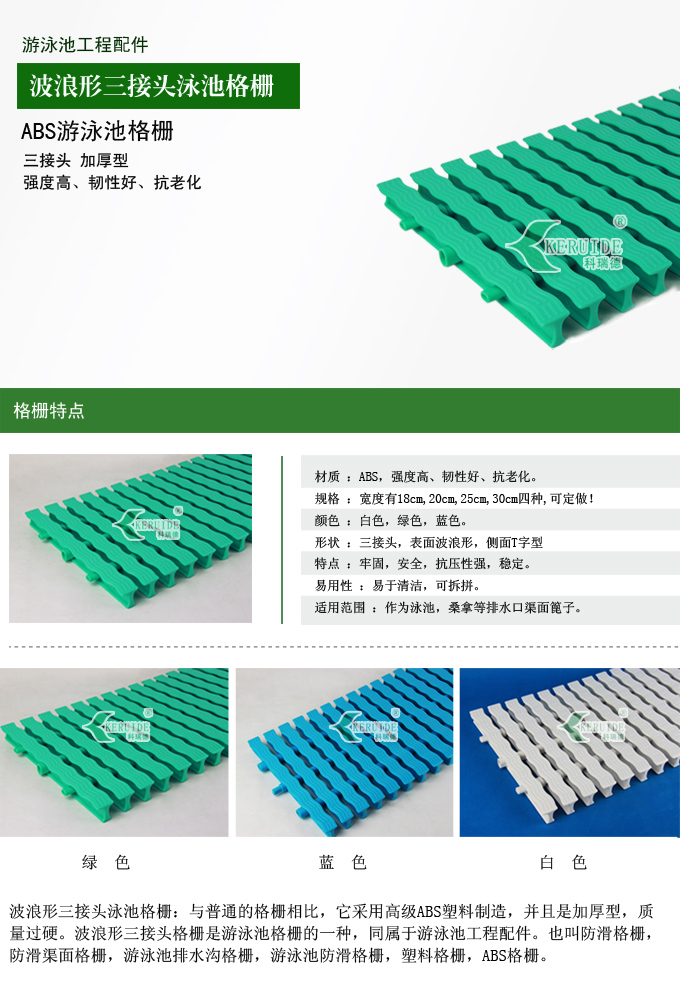 波浪形三接頭泳池格柵:與普通的游泳池格柵相比,它采用高級ABS塑料制造,并且是加厚型,質(zhì)量過硬。波浪形三接頭格柵是游泳池格柵的一種,同屬于游泳池工程配件。也叫防滑格柵,防滑渠面格柵,游泳池排水溝格柵,游泳池防滑格柵,塑料格柵,ABS格柵。
