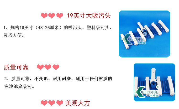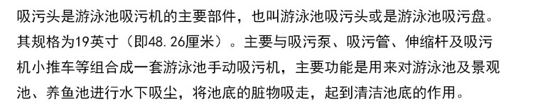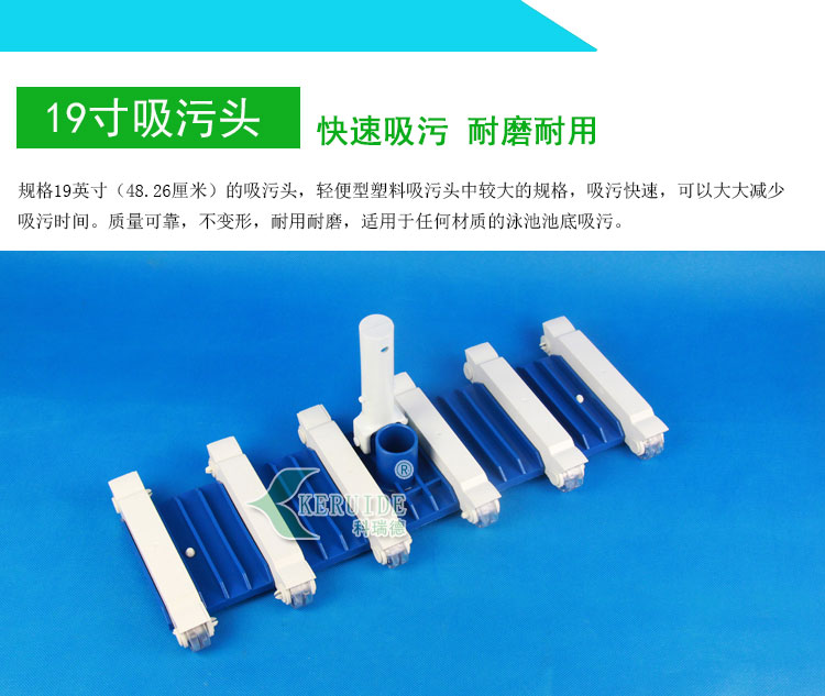 游泳池吸污頭:是泳池吸污機(jī)的主要配件之一。本吸污頭為19英寸(即48.26厘米)塑料吸污頭,配塑料手柄、吸污時(shí)較一般的小吸污頭更快速,操作靈活、方便。