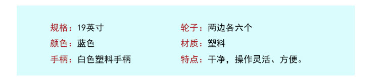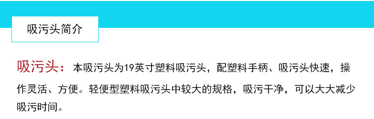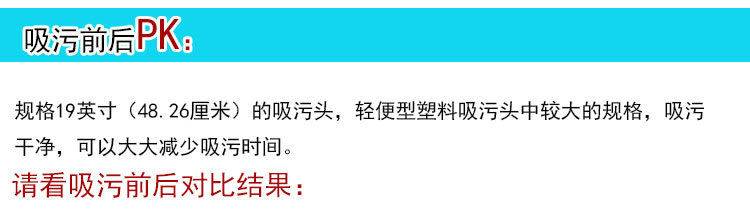 1、規(guī)格19英寸(48.26厘米)的吸污頭,輕便型塑料吸污頭中較大的規(guī)格,吸污更快,可以大大減少吸污時(shí)間。
