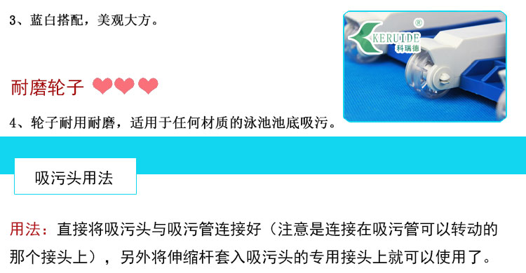 2、質(zhì)量可靠,不變形,耐用耐磨,適用于任何材質(zhì)的泳池池底吸污。