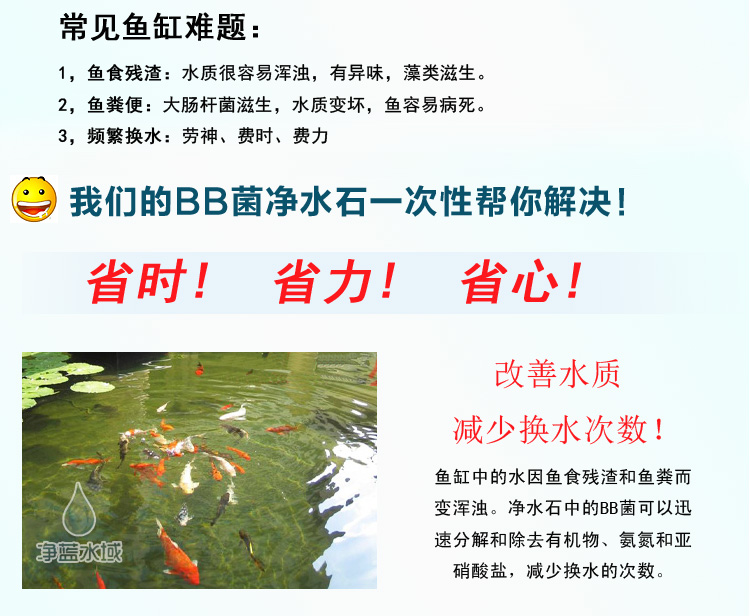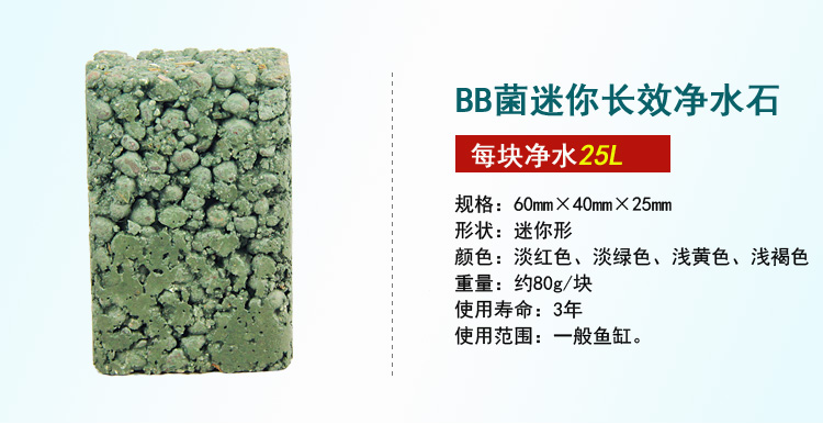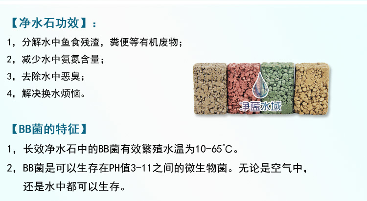 此bb菌凈水石為美和大微牌微生物凈水石,通過(guò)bb菌作用分解有機(jī)廢物和無(wú)機(jī)物,非常環(huán)保,長(zhǎng)期有效,每塊凈水石可使用3年左右。而且bb菌對(duì)魚兒無(wú)影響,可以放心使用。