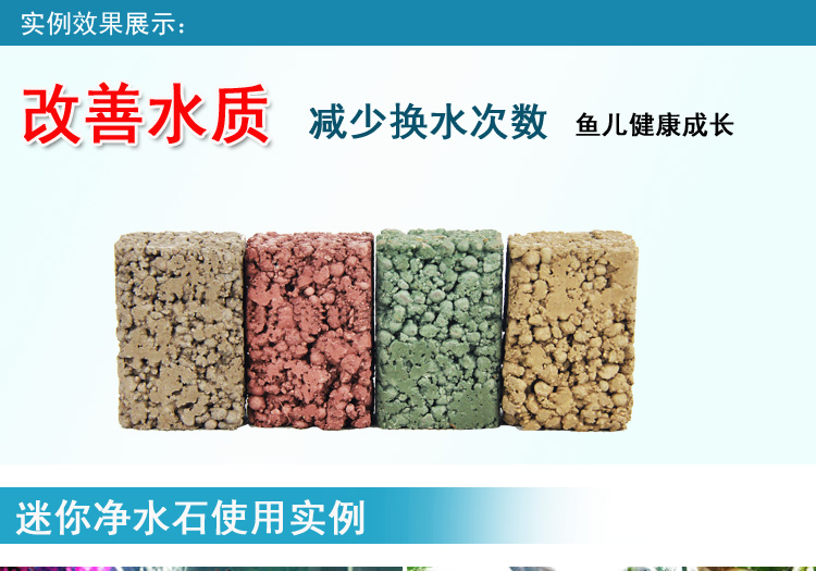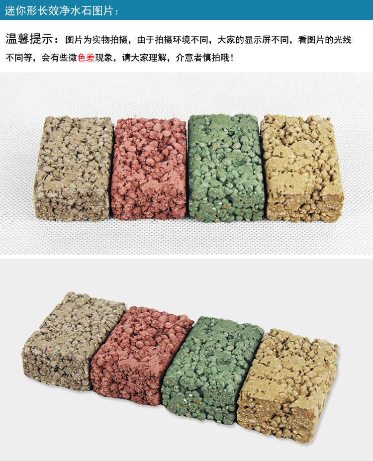 迷你長(zhǎng)效凈水石是魚缸凈水石的一種,也叫做BB菌凈水石。其由輕量骨材、水泥、顏料、水制成,制作過(guò)程中封入bb菌,主要用于魚缸凈化水質(zhì),可以有效分解魚糞、魚食殘?jiān)?,除去氨氮等廢物,從根源上除去臭味,凈化水質(zhì)。