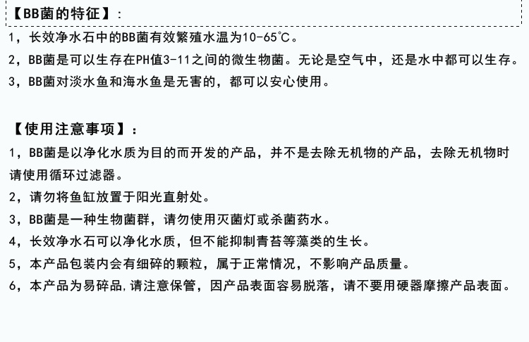 【溫馨提示】:BB菌凈水石安全環(huán)保,長(zhǎng)效免維護(hù)。使用前要先浸泡24小時(shí),再放入魚缸中。微生物產(chǎn)品見效比化學(xué)藥劑要慢一些,短至一周,長(zhǎng)至數(shù)周。性急的魚友慎拍!如果魚缸密度大,又不使用過(guò)濾器的,請(qǐng)慎用! 由于養(yǎng)魚習(xí)慣及養(yǎng)魚的環(huán)境不同,所達(dá)到的效果不同,使用時(shí)間長(zhǎng)短不同。請(qǐng)保持良好的養(yǎng)魚環(huán)境。