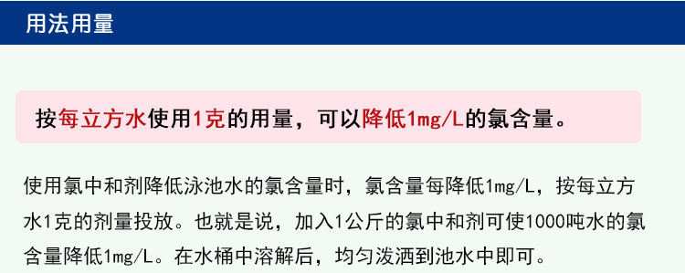 2、按每立方水1克的用量,可以降低1mg/L的氯含量。