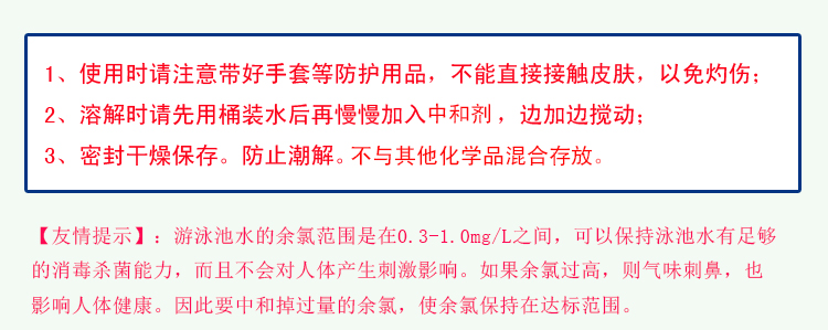 2)使用游泳池氯中和劑時(shí)佩戴橡膠手套、保護(hù)眼鏡或面罩,避免接觸皮膚、眼睛或衣服。如不慎接觸請(qǐng)用水沖洗10分鐘左右,如有不適請(qǐng)求醫(yī)。若誤吞服,請(qǐng)大量飲水并馬上求醫(yī)。