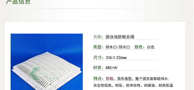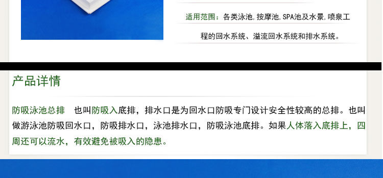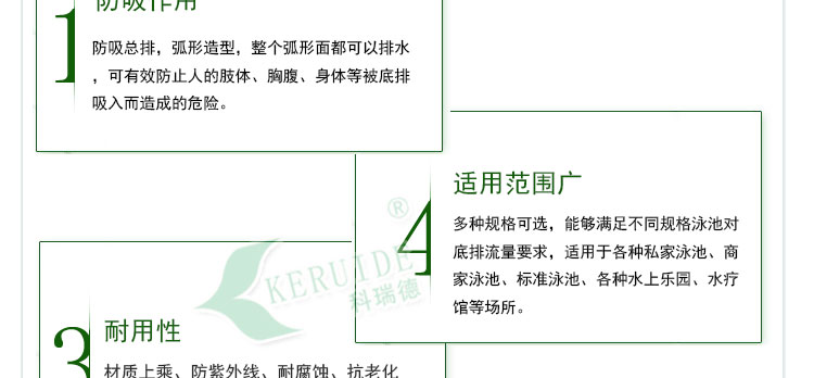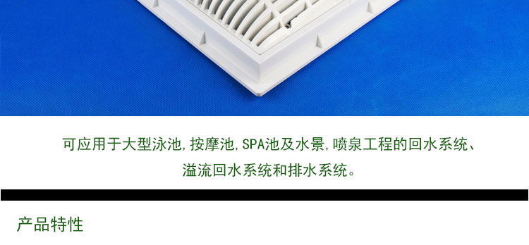 4、多種規(guī)格可選,能夠滿足不同規(guī)格泳池對(duì)底排流量要求,適用于各種私家泳池、商家泳池、標(biāo)準(zhǔn)泳池、各種水上樂園、水療館等場所。