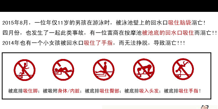 傳統(tǒng)的游泳池排水口表面為平面,排水時(shí)水流從同一個(gè)平面排水,造成的吸力非常大,容易發(fā)生險(xiǎn)情。然而現(xiàn)在有了防吸回水口,能有效避免回水口吸人了的隱患。