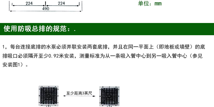 1,每臺(tái)連接底排的水泵必須并聯(lián)安裝兩套底排,并且在同一平面上(即地板或墻壁)的底排吸口必須隔開至少0.92米安裝,測量標(biāo)準(zhǔn)為從一條吸入管中心到另一吸入管中心。