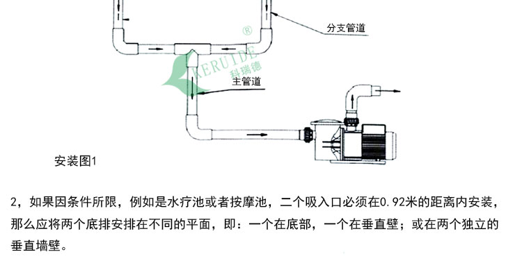 2,如果因條件所限,例如是水療池或者按摩池,二個(gè)吸入口必須在0.92米的距離內(nèi)安裝,那么應(yīng)將兩個(gè)底排安排在不同的平面,即:一個(gè)在底部,一個(gè)在垂直壁;或在兩個(gè)獨(dú)立的垂直墻壁。