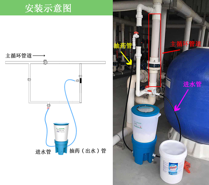 科瑞德?泳池自動(dòng)投藥器利用泳池本身的循環(huán)系統(tǒng),安裝簡(jiǎn)單,采用循環(huán)系統(tǒng)進(jìn)行高壓噴淋來(lái)溶解消毒片,其溶解速度快,使得投藥器能適合大的泳池進(jìn)行自動(dòng)投藥。 以下圖片為投藥器安裝示意圖: