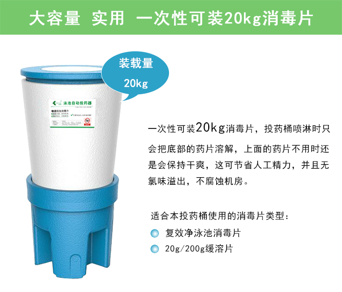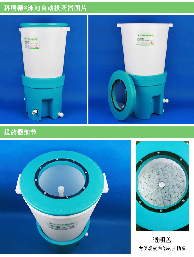 科瑞德?泳池自動(dòng)投藥器是用于投加固體消毒片的投藥器,也叫泳池自動(dòng)加藥桶,其采用的固液分離、即用即溶、桶內(nèi)負(fù)壓、水隔式密封等技術(shù)手段,使得投藥器很適合用來(lái)自動(dòng)投加固體消毒片,并且在投放過(guò)程中不會(huì)有氯味溢出。另外它還有一個(gè)特點(diǎn),就是裝載量大,一次性可裝20kg的消毒片,可用的消毒片有復(fù)效凈泳池消毒片、泳池緩溶片等。