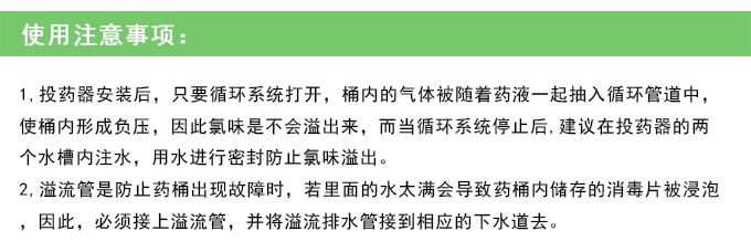 1,泳池自動(dòng)投藥器安裝后,只要循環(huán)系統(tǒng)打開(kāi),桶內(nèi)的氣體被隨著藥液一起抽入循環(huán)管道中,使桶內(nèi)形成負(fù)壓,因此氯味是不會(huì)溢出來(lái),而當(dāng)循環(huán)系統(tǒng)停止后,建議在投藥器的兩個(gè)水槽內(nèi)注水,用水進(jìn)行密封防止氯味溢出。