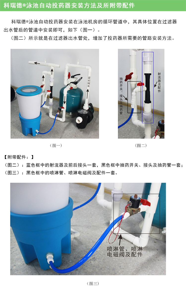 科瑞德?泳池自動(dòng)投藥器安裝在泳池機(jī)房的循環(huán)管道中,其具體位置在過(guò)濾器出水管后的管道中安裝即可。