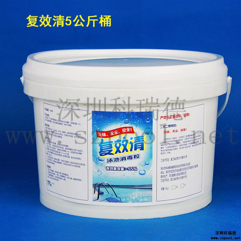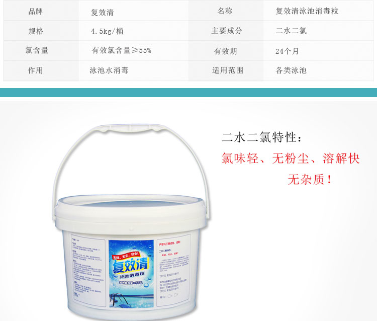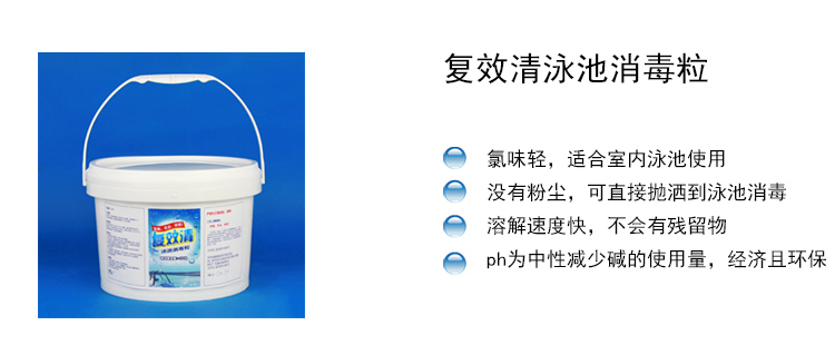復(fù)效清泳池消毒粒:有效氯含量≥55%,其特點是:氯味輕——穩(wěn)定性好!無粉塵——不用擔(dān)心吸入鼻孔!pH中性——不會導(dǎo)致池水pH下降!溶解性好!