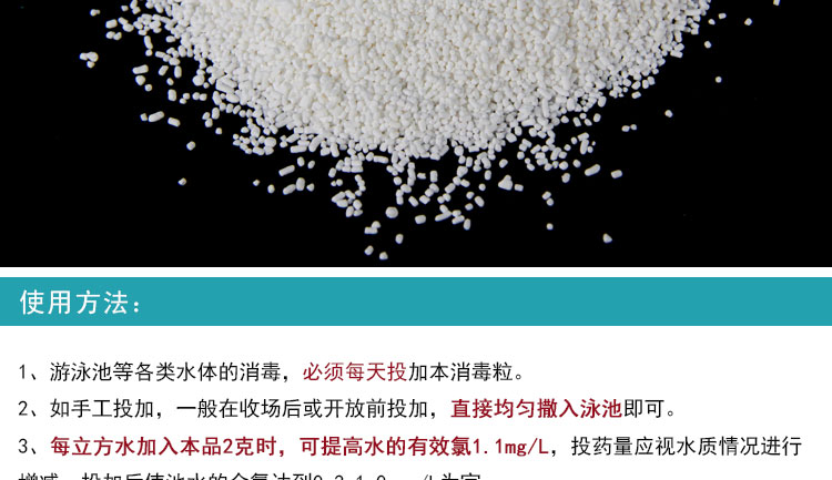復(fù)效清泳池消毒粒使用方法:(消毒??芍苯尤鋈胗境?,溶解性好,無殘渣,持久穩(wěn)定)