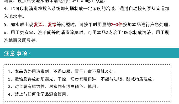復(fù)效清泳池消毒粒注意事項: