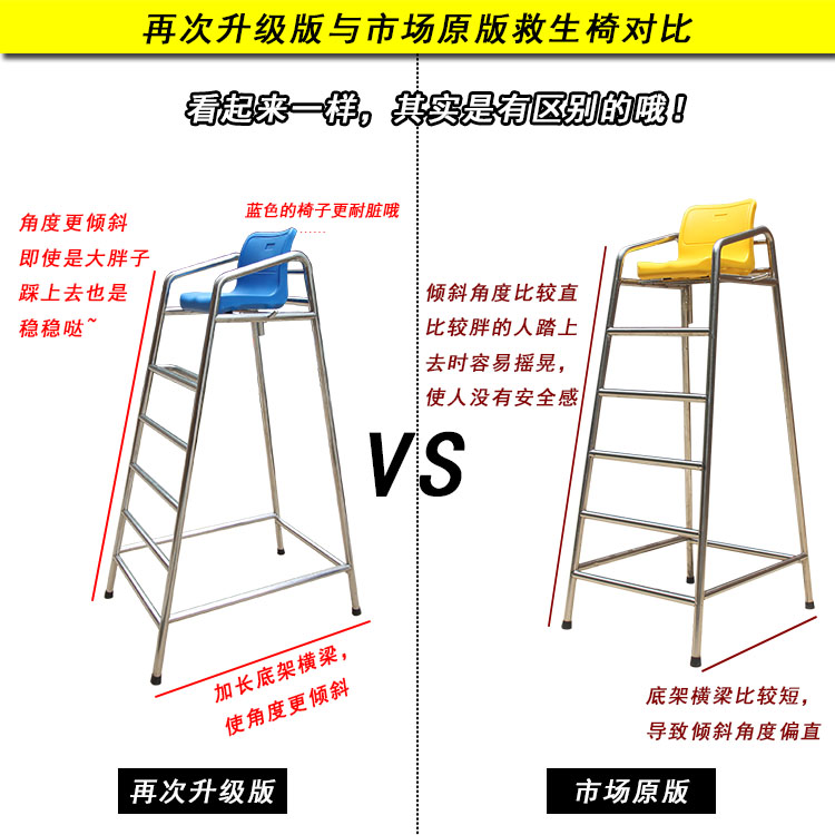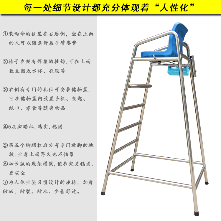 本款救生椅為加厚版,與以往的款式相比,此款救生椅使用便捷、人性化設(shè)計(jì),除了將原有安裝太陽(yáng)傘的位置改放到救生椅后背外(原款安裝太陽(yáng)傘的位置是在側(cè)邊,會(huì)檔到手和妨礙視線),還在側(cè)邊位置增加了可掛籃子的孔位,還有掛鉤,讓救生員可隨時(shí)拿放瓶子、毛巾、太陽(yáng)鏡等必要物品,在原有設(shè)計(jì)的基礎(chǔ)上,讓救生員感覺(jué)舒適,視覺(jué)更開(kāi)闊靈敏~(yú)!另外救生椅的底架寬度也比原來(lái)的要寬哦,這樣椅架的角度更傾斜,重心更穩(wěn)哦!