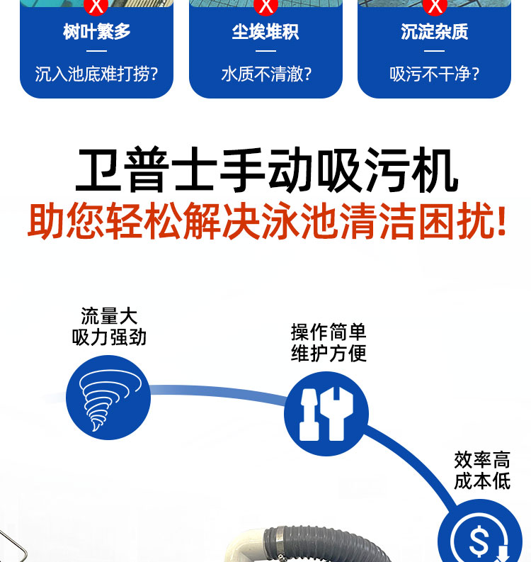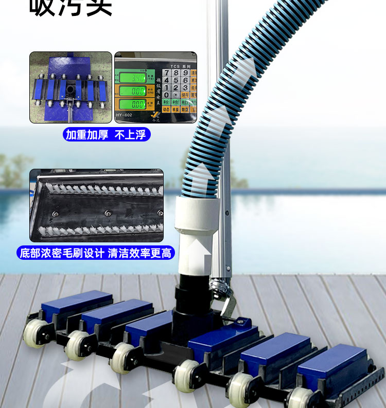 Wepools衛(wèi)普士 泳池吸污機(jī)(組合式,岸基式):岸基型組合式泳池吸污機(jī)也叫手動(dòng)吸污機(jī),主要用于游泳池水底的吸污和吸塵。此款吸污器為岸基型泳池吸污機(jī),單人操作,流量大吸力強(qiáng),經(jīng)濟(jì)耐用,是目前游泳池清潔使用普遍的一種,適合各種游泳池吸污用。?由于是手動(dòng)吸污機(jī),需要人工操作,也可以用于魚(yú)池及景觀池吸污。