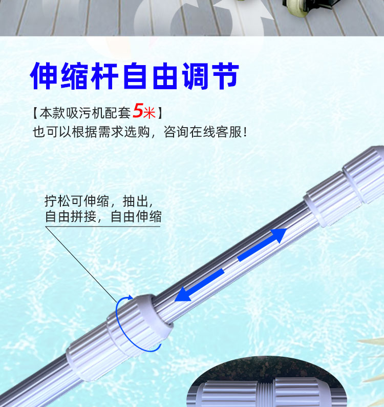 一般繩拉式吸污機(jī)所配的繩子長(zhǎng)度為30米,所配的吸污管也有30米,吸污盤(pán)的寬度70cm,因此它的吸污距離寬,吸力大,用于較大的標(biāo)準(zhǔn)池(長(zhǎng)50米,寬25米)。