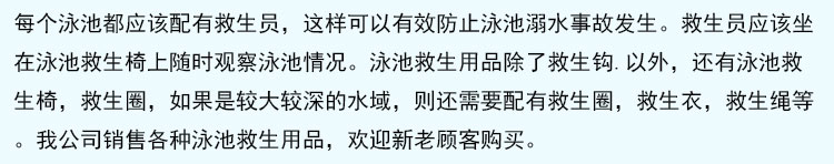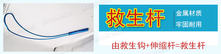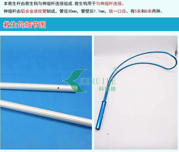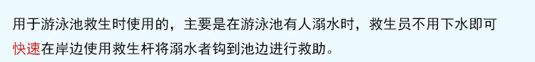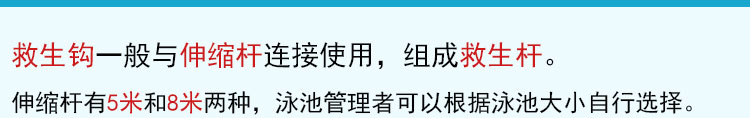 游泳池救生桿:是由救生鉤及伸縮桿組合而成的游泳池救生桿是屬于游泳救生用品的一種。它是游泳池、水上樂(lè)園等救生器材,用于游泳救生員快速打撈溺水者的專(zhuān)業(yè)工具。它的長(zhǎng)度有5米和8米兩種,主要根據(jù)游泳池的大小來(lái)選擇不同長(zhǎng)度。游泳救生員能夠快速打撈溺水者。防范溺水事故的發(fā)生。