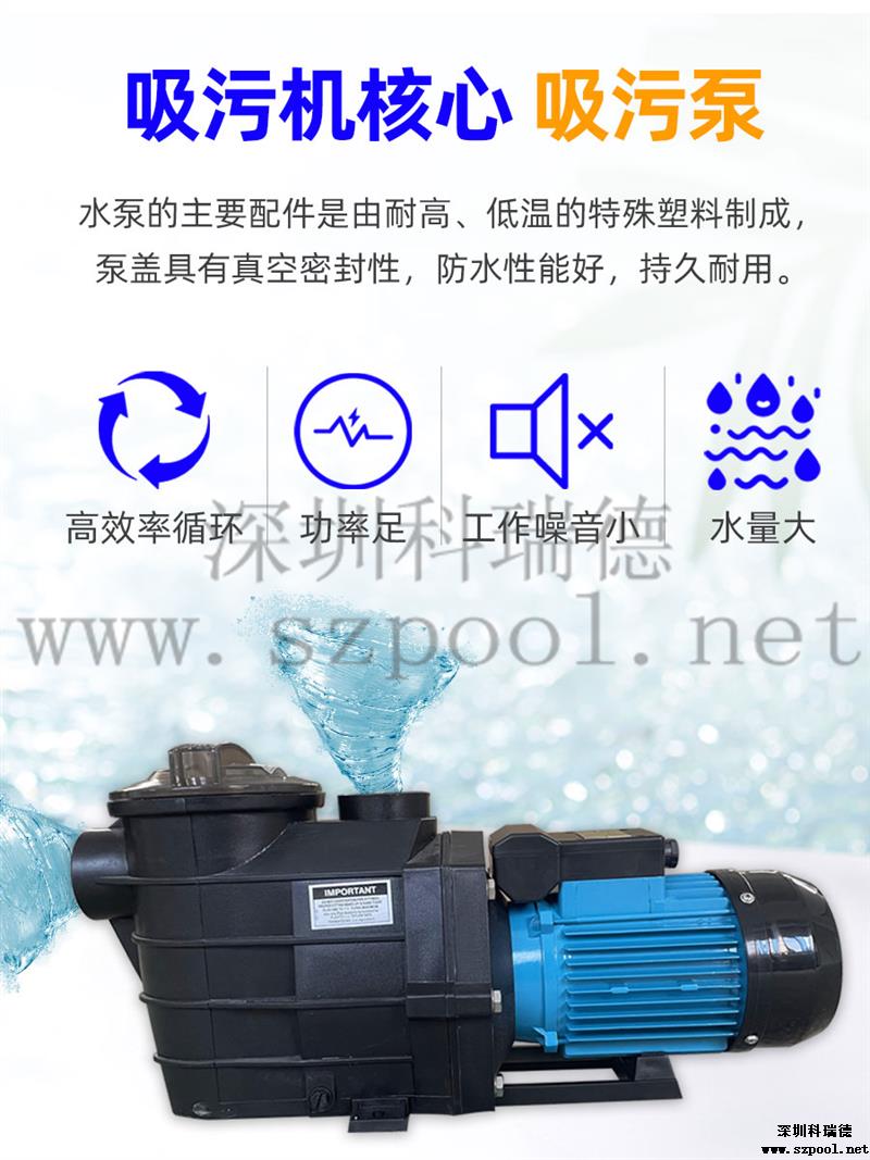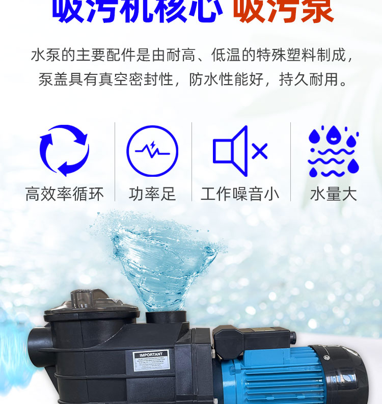 對(duì)于游泳池經(jīng)營(yíng)者而言,游泳池水質(zhì)的好壞是能否吸引客戶的關(guān)鍵,而游泳池水質(zhì)維護(hù)不管平時(shí)做得有多好多仔細(xì),都避免不了水會(huì)變渾濁,水底有垃圾及毛發(fā)沉淀,因此吸污機(jī)在游泳池水處理過(guò)程中起著關(guān)鍵的作用。