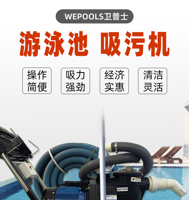 游泳池吸污機(jī)主要用于游泳池池底吸塵,本型號(hào)為:衛(wèi)普士吸污機(jī)3012型,使用時(shí)主機(jī)放在岸邊,吸污管及吸污頭用伸縮桿伸入水底進(jìn)行吸塵,所以也叫岸基型游泳池吸污機(jī)。