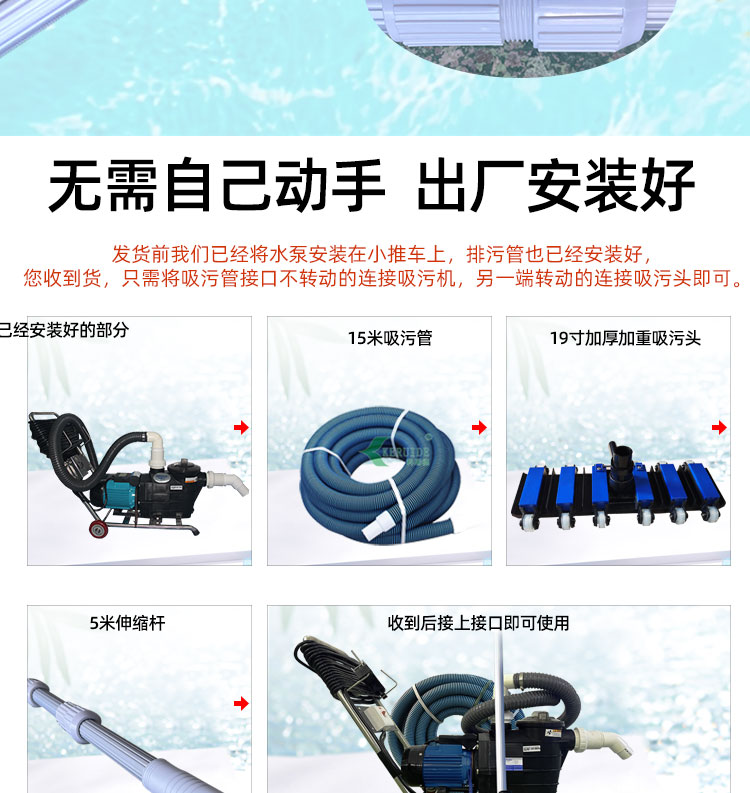 除了配備的吸污頭及電纜線優(yōu)于與市場(chǎng)上大部分手動(dòng)吸污機(jī),本款吸污機(jī)的吸污管也同樣配備的是優(yōu)質(zhì)雙色雙層自浮加厚吸污管,10米一節(jié),一個(gè)吸污機(jī)配備3節(jié)吸污管共30米長(zhǎng)。此吸污管耐磨、耐壓、硬度高、不易變形,性?xún)r(jià)比高。便于大家收到貨后使用以及運(yùn)輸安全,本款吸污泵在發(fā)貨前我們就已將水泵安裝專(zhuān)用的小車(chē)上,排污管也已裝在吸污泵上,各位收到貨后,按照以下圖片指示安裝即可使用。