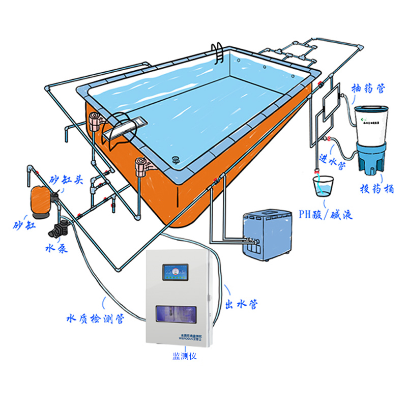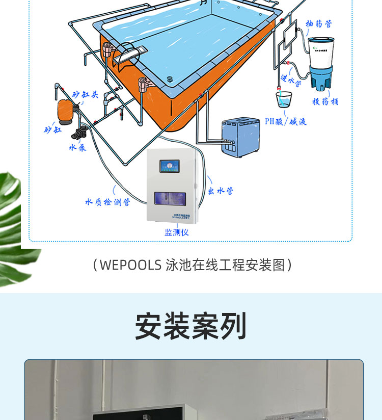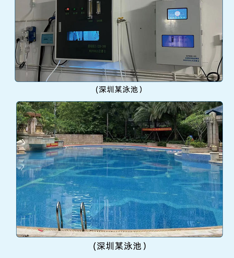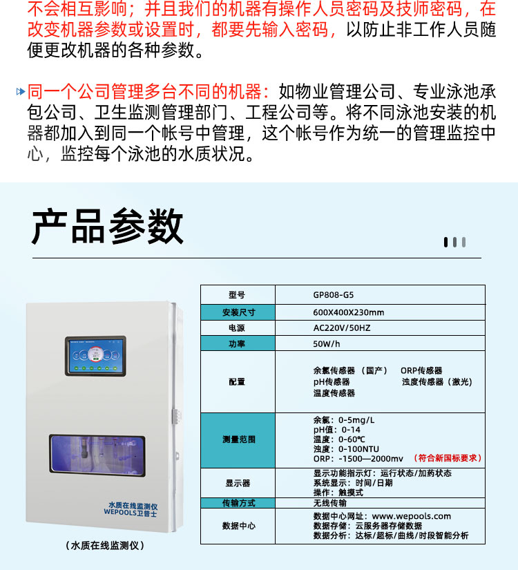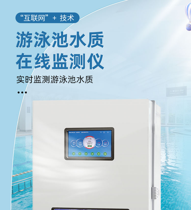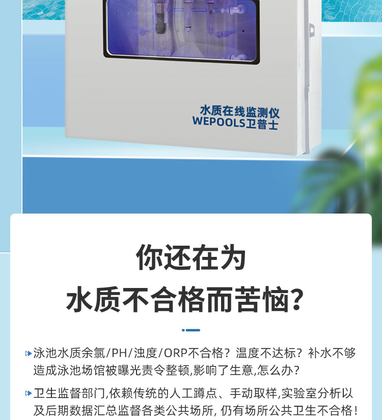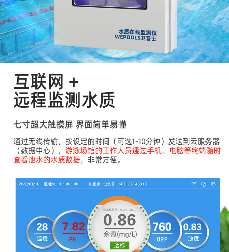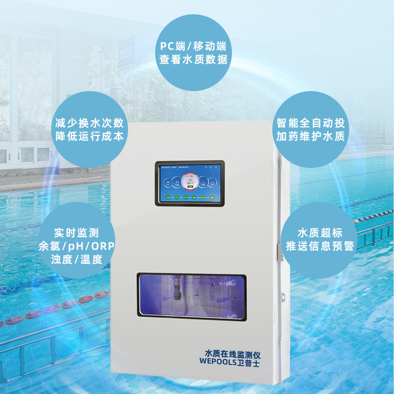 WEPOOLS 衛(wèi)普士水質(zhì)在線監(jiān)測儀是一款實(shí)時(shí)在線監(jiān)測泳池水質(zhì)余氯/pH/濁度/ORP/溫度的監(jiān)測儀。它與時(shí)俱進(jìn),符合新國標(biāo)GB 37487-2019《公共場所衛(wèi)生管理規(guī)范》、GB 37488-2019《公共場所衛(wèi)生指標(biāo)及限值要求》、GB 37489.3-2019《公共場所設(shè)計(jì)衛(wèi)生規(guī)范第3部分:人工游泳場所》等三個國家標(biāo)準(zhǔn)的要求;它自動加(停)藥,保證水質(zhì)余氯及PH達(dá)標(biāo),系統(tǒng)自動化加(停)藥控制系統(tǒng),能根據(jù)當(dāng)前檢測結(jié)果,自動調(diào)節(jié)加藥頻率,可以確保泳池水的余氯不隨天氣、泳客人數(shù)等因素變化的影響,保持池水余氯的相對穩(wěn)定且符合標(biāo)準(zhǔn),從而保證水質(zhì)衛(wèi)生。從根本上解決了A、人工加藥無法準(zhǔn)確定量的問題;B、人工加藥無法達(dá)到均勻的問題;C、人工加藥無法持續(xù)不斷添加的問題;它自動傳輸信息和自動預(yù)警,使用單位、衛(wèi)監(jiān)部門可隨時(shí)掌握水質(zhì)的動態(tài)變化和接收預(yù)警,敦促泳池工作人員加強(qiáng)水質(zhì)管理,確保池水各項(xiàng)衛(wèi)生指標(biāo)在國家標(biāo)準(zhǔn)的限值范圍內(nèi)。;它實(shí)現(xiàn)泳客的知情權(quán),社會的監(jiān)督權(quán),泳池水質(zhì)各項(xiàng)指標(biāo)的實(shí)時(shí)監(jiān)測結(jié)果會傳輸?shù)斤@示屏上對外公布,讓泳客對原本摸不著、看不見的水質(zhì)狀況變?yōu)榭吹玫?、看得清的、?shí)實(shí)在在的數(shù)據(jù)!