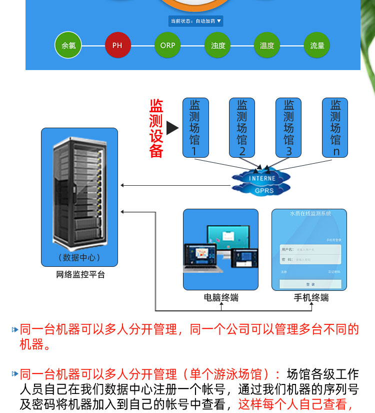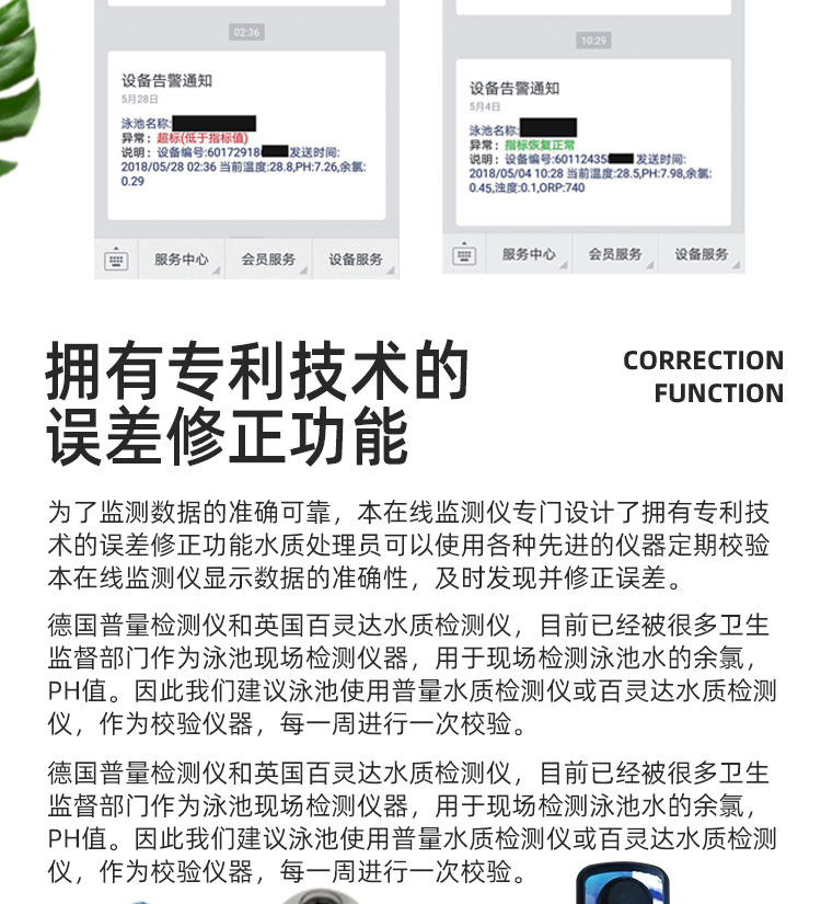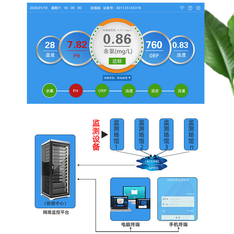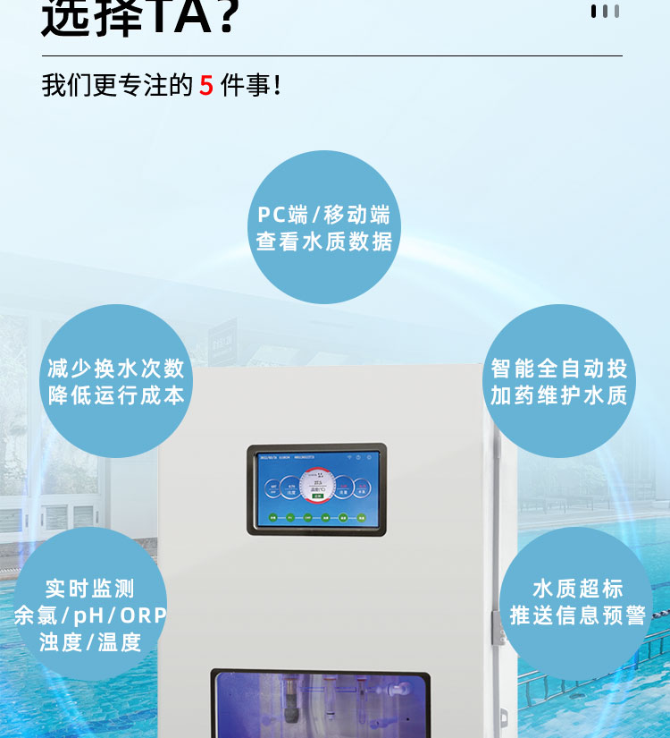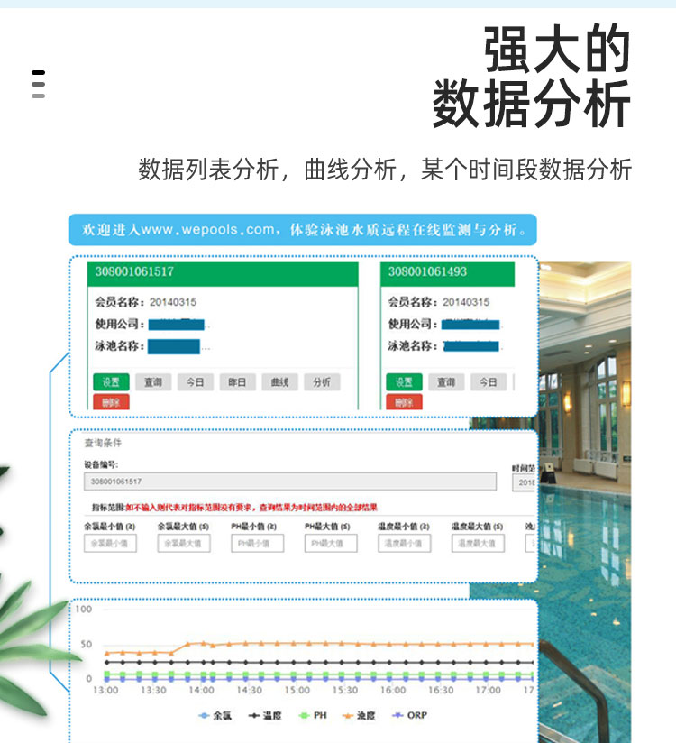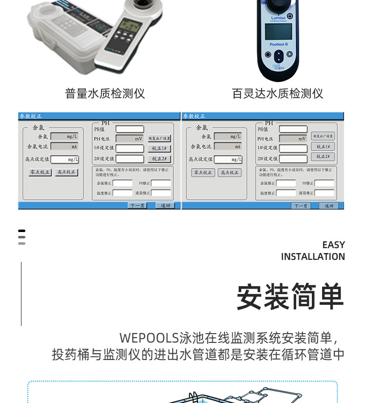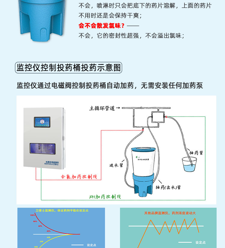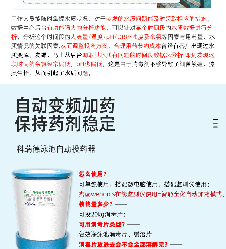 WEPOOLS 衛(wèi)普士水質(zhì)在線監(jiān)測儀是一款實(shí)時(shí)在線監(jiān)測泳池水質(zhì)余氯/pH/濁度/ORP/溫度的監(jiān)測儀。它與時(shí)俱進(jìn),符合新國標(biāo)GB 37487-2019《公共場所衛(wèi)生管理規(guī)范》、GB 37488-2019《公共場所衛(wèi)生指標(biāo)及限值要求》、GB 37489.3-2019《公共場所設(shè)計(jì)衛(wèi)生規(guī)范第3部分:人工游泳場所》等三個國家標(biāo)準(zhǔn)的要求;它自動加(停)藥,保證水質(zhì)余氯及PH達(dá)標(biāo),系統(tǒng)自動化加(停)藥控制系統(tǒng),能根據(jù)當(dāng)前檢測結(jié)果,自動調(diào)節(jié)加藥頻率,可以確保泳池水的余氯不隨天氣、泳客人數(shù)等因素變化的影響,保持池水余氯的相對穩(wěn)定且符合標(biāo)準(zhǔn),從而保證水質(zhì)衛(wèi)生。從根本上解決了A、人工加藥無法準(zhǔn)確定量的問題;B、人工加藥無法達(dá)到均勻的問題;C、人工加藥無法持續(xù)不斷添加的問題;它自動傳輸信息和自動預(yù)警,使用單位、衛(wèi)監(jiān)部門可隨時(shí)掌握水質(zhì)的動態(tài)變化和接收預(yù)警,敦促泳池工作人員加強(qiáng)水質(zhì)管理,確保池水各項(xiàng)衛(wèi)生指標(biāo)在國家標(biāo)準(zhǔn)的限值范圍內(nèi)。;它實(shí)現(xiàn)泳客的知情權(quán),社會的監(jiān)督權(quán),泳池水質(zhì)各項(xiàng)指標(biāo)的實(shí)時(shí)監(jiān)測結(jié)果會傳輸?shù)斤@示屏上對外公布,讓泳客對原本摸不著、看不見的水質(zhì)狀況變?yōu)榭吹玫?、看得清的、?shí)實(shí)在在的數(shù)據(jù)!
