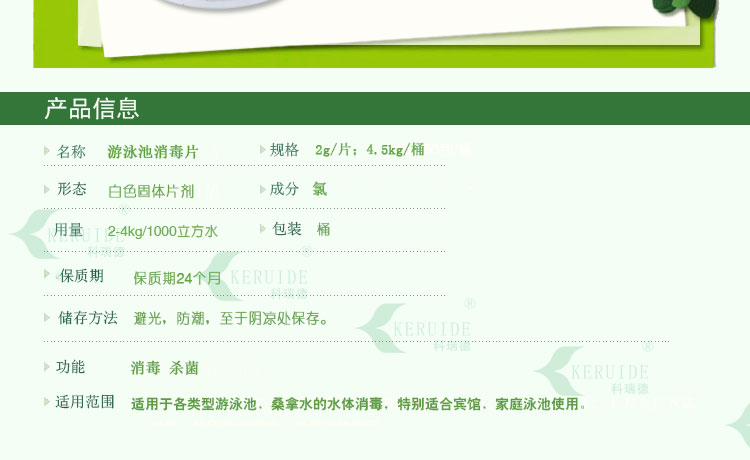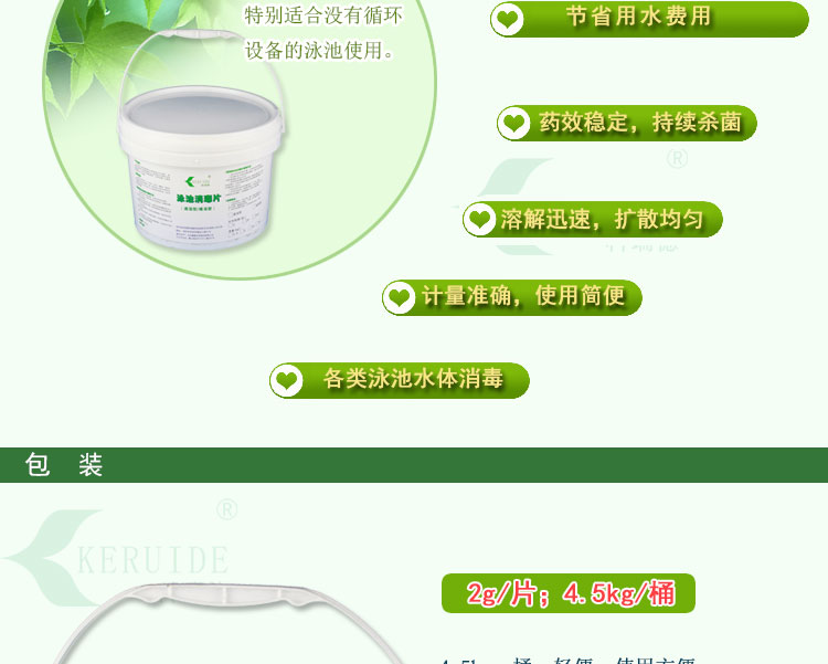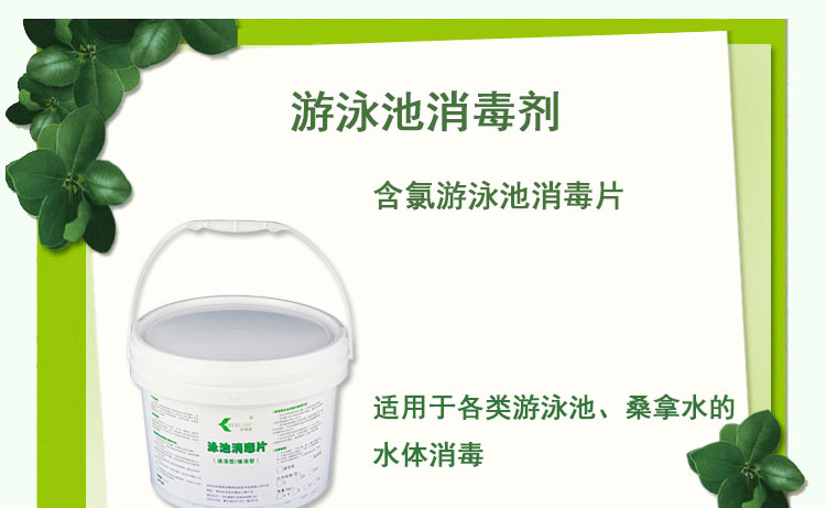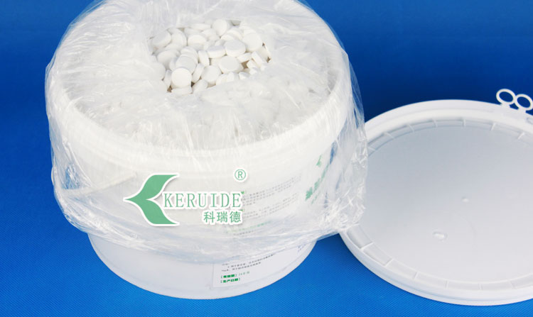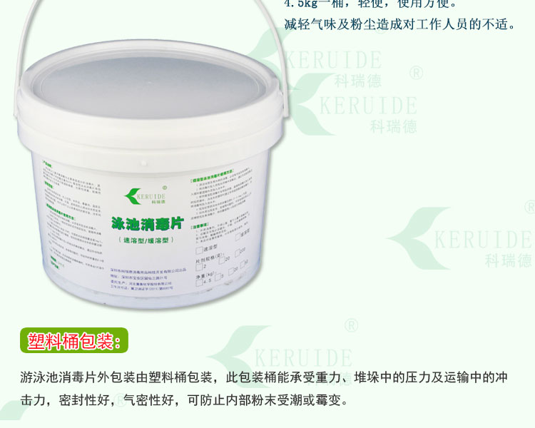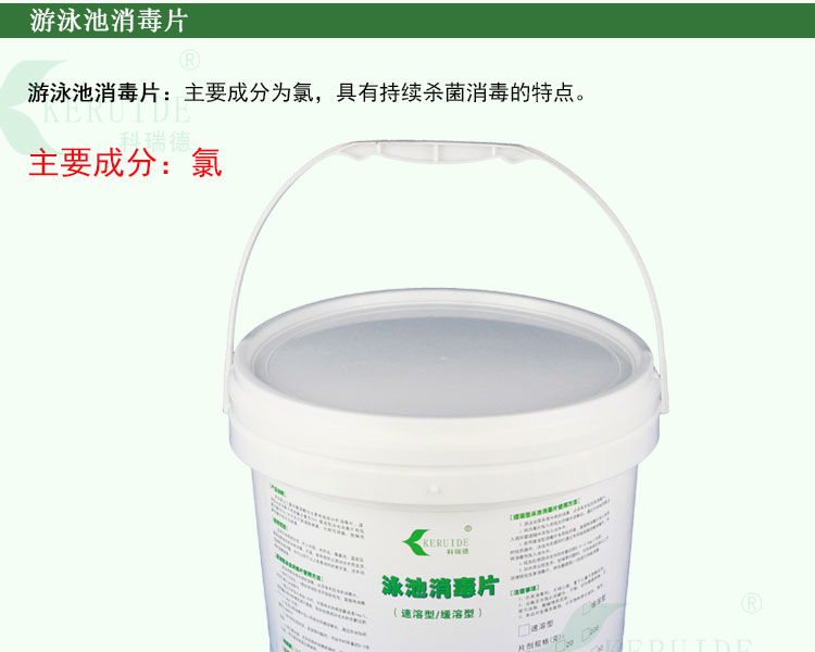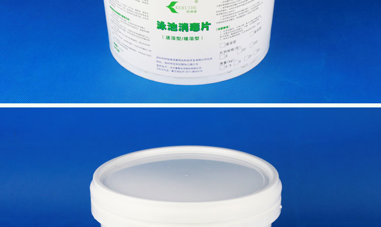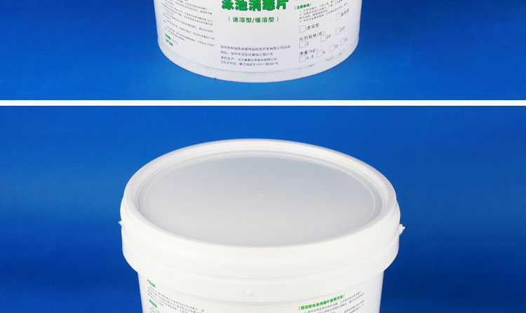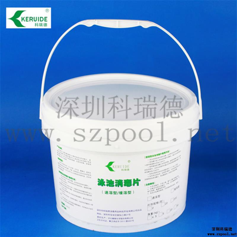 4.5kg/桶的消毒片:主要成分也是氯,主要由氯復(fù)配而成的泳池水處理劑,能迅速溶解,因此也叫速溶消毒片或氯丸。