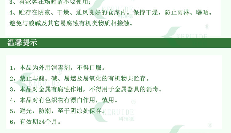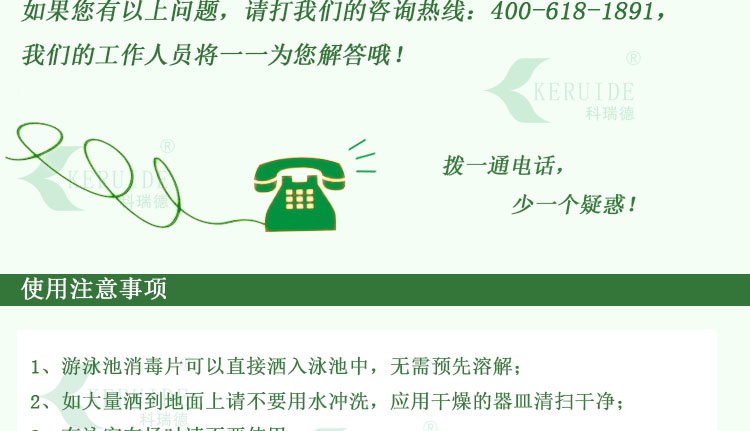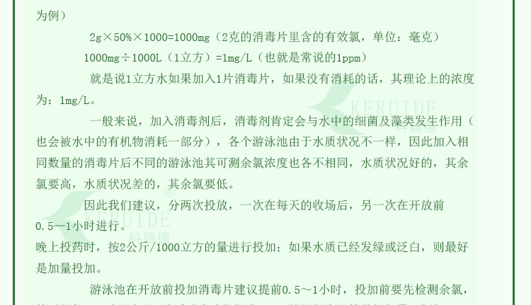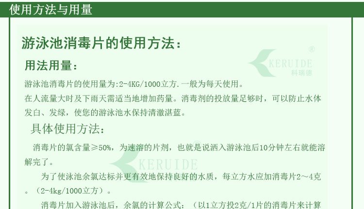 【用法用量】:用于游泳池水消毒時,每天用量約為每1000立方投放2-4公斤,泳客較多或下雨天氣時要適當(dāng)?shù)卦黾铀幜?。消毒劑的投放量足夠時,可以防止水體發(fā)白、發(fā)綠,使你的游泳池水保持清澈湛藍(lán)。
