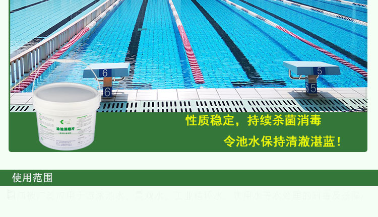 泳池消毒片的溶解性比游泳池消毒粉好,可以直接灑入泳池中,游泳池消毒片在池底迅速溶解,余氯能快速、均勻地擴(kuò)散到整個泳池水中,能快速提高泳池水中的余氯,適合開場前補(bǔ)充余氯,并且特別適合沒有循環(huán)設(shè)備的泳池使用。