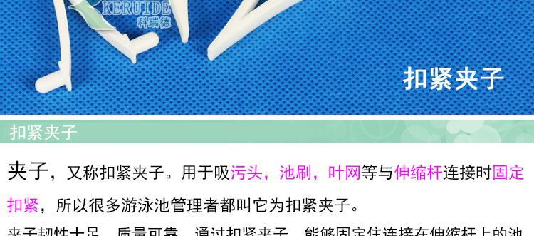 夾子,又稱扣緊夾子。用于吸污頭,池刷,葉網(wǎng)等與伸縮桿連接時(shí)固定扣緊,所以很多游泳池工作者都叫它為扣緊夾子。