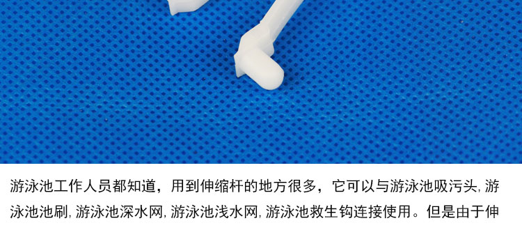 游泳池工作人員都知道,用到伸縮桿的地方很多,它可以與游泳池吸污頭,游泳池池刷,游泳池深水網(wǎng),游泳池淺水網(wǎng),游泳池救生鉤連接使用。但是由于伸縮桿自身的特點(diǎn)(圓柱形,相對(duì)較光滑),與其連接的泳池用品穩(wěn)定程度都不能夠達(dá)到要求。而且,無(wú)論是葉網(wǎng),還是池刷,還是吸污頭這些泳池用品工作的時(shí)候都是活動(dòng)比較大的,如果沒(méi)有扣緊夾子,在工作過(guò)程中很容易松動(dòng)或者滑脫,影響吸污和刷洗工作。