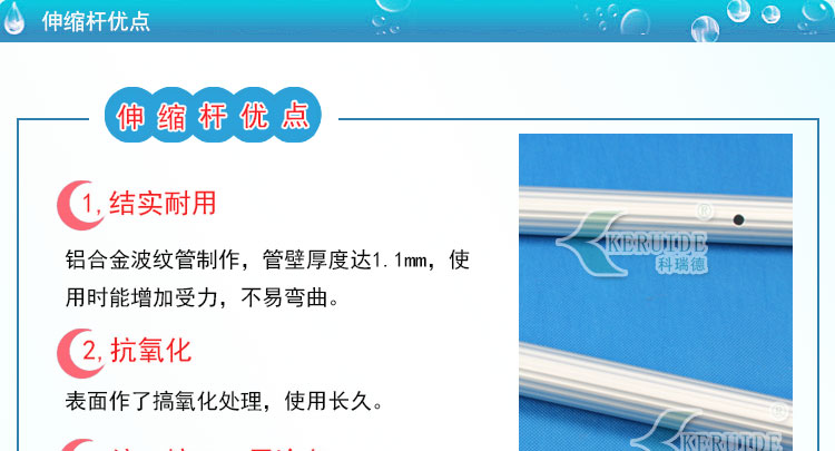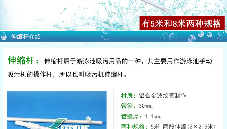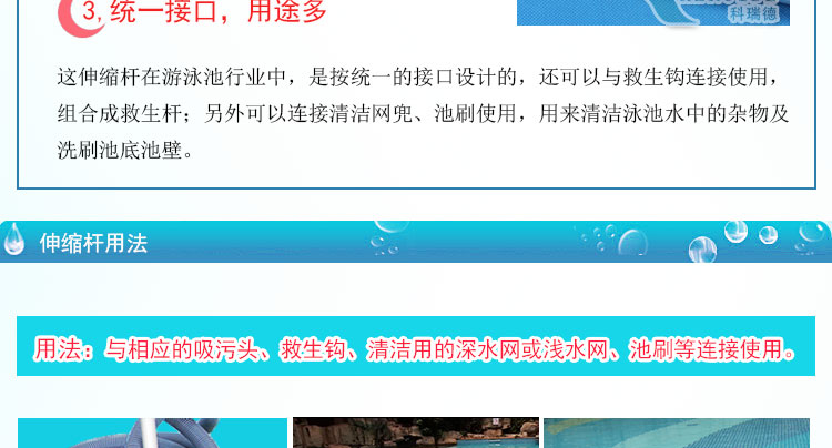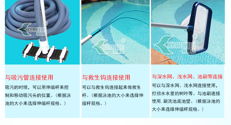 泳池伸縮桿的用處很多,可以與游泳池吸污頭,游泳池池刷,游泳池深水網(wǎng),游泳池淺水網(wǎng),游泳池救生鉤連接使用。如果5米的泳池伸縮桿不夠長(zhǎng),您可以選擇8米的伸縮桿,