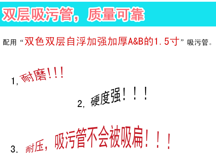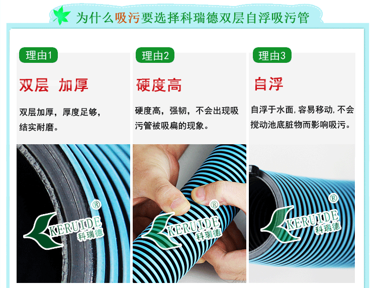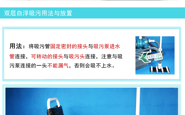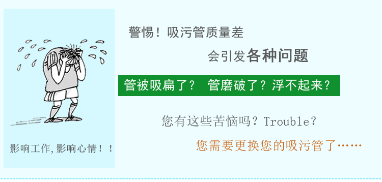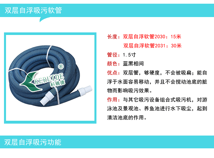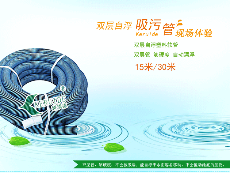雙層管,夠硬度,耐壓耐用,不會(huì)被吸扁;能自浮于水面容易移動(dòng),并且不會(huì)攪動(dòng)池底的臟物而影響吸污效果。