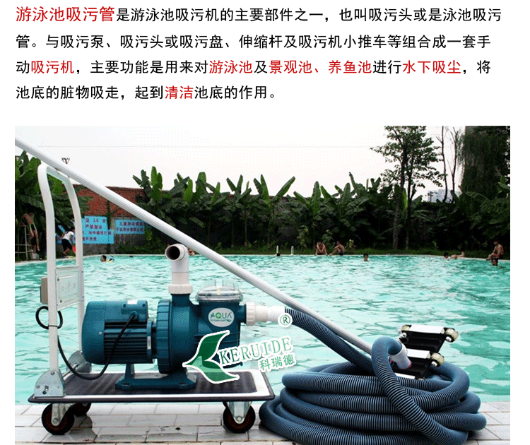 泳池吸污管是游泳池吸污機(jī)的主要部件之一,也叫吸污管或是泳池吸污管。與吸污泵、吸污頭或吸污盤、伸縮桿及吸污機(jī)小推車等組合成一套游泳池手動(dòng)吸污機(jī),主要功能是用來對(duì)游泳池及景觀池、養(yǎng)魚池進(jìn)行水下吸塵,將池底的臟物吸走,起到清潔池底的作用。