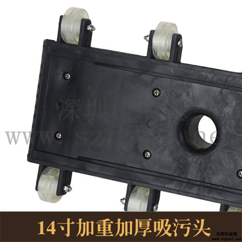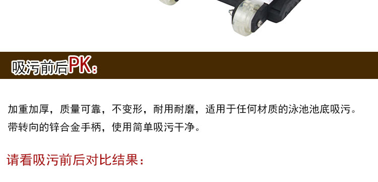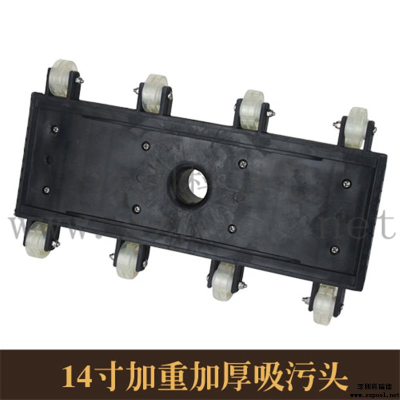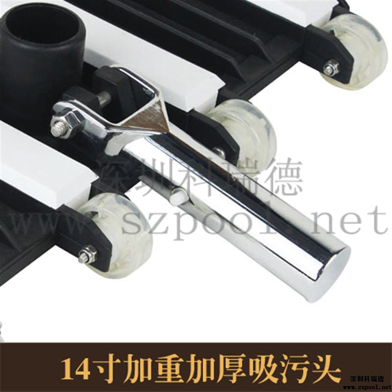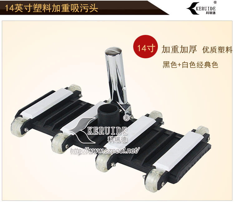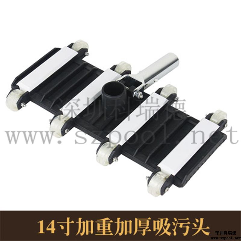 游泳池吸污頭:本吸污頭為14英寸塑料加重吸污頭,帶有鋅合金手柄、聚氨酯料滾珠輪子、ABS吸污管轉(zhuǎn)換接頭,讓你在吸污時更貼緊池底不易上浮,并且操作更加靈活、方便,質(zhì)量可靠,耐磨耐用,適合于池底為任何材質(zhì)的泳池吸污。