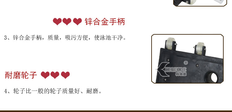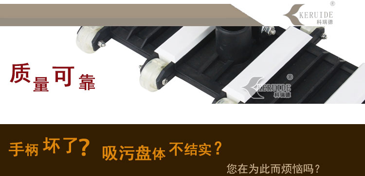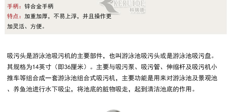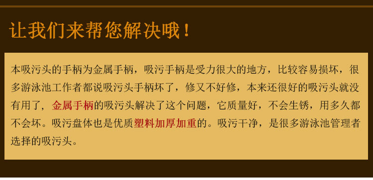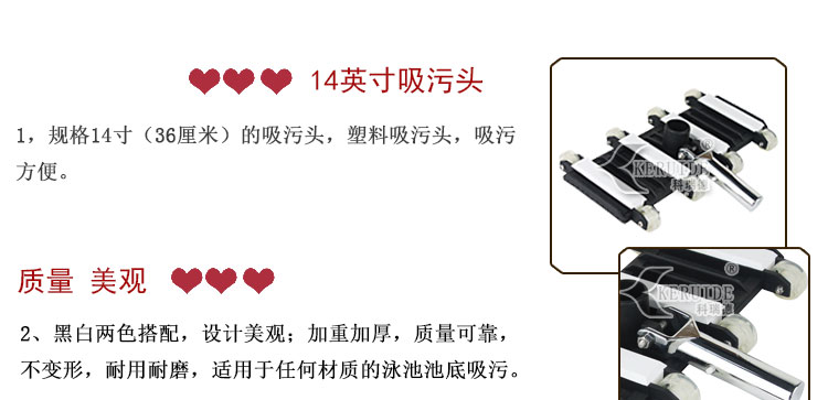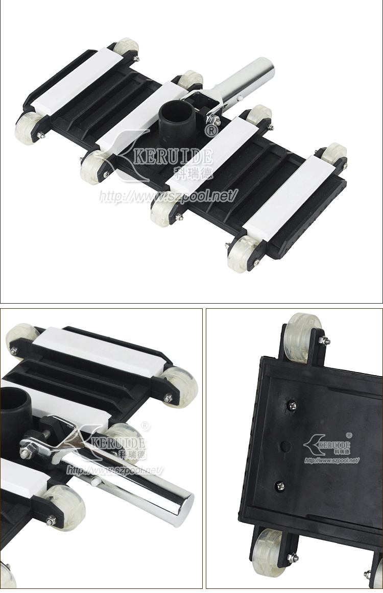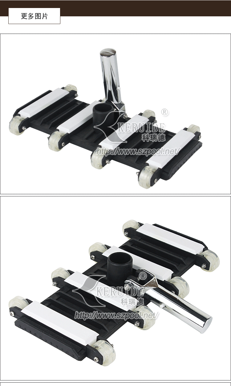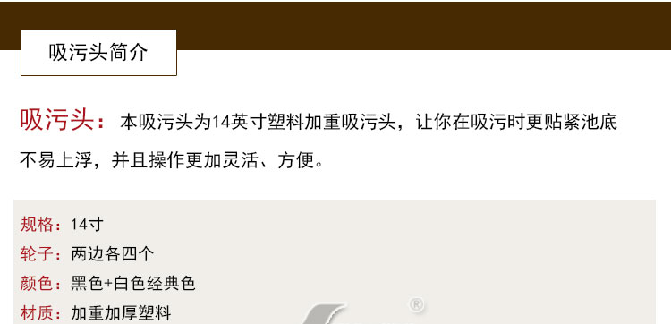 游泳池吸污頭:本吸污頭為14英寸塑料加重吸污頭,帶有鋅合金手柄、聚氨酯料滾珠輪子、ABS吸污管轉(zhuǎn)換接頭,讓你在吸污時更貼緊池底不易上浮,并且操作更加靈活、方便,質(zhì)量可靠,耐磨耐用,適合于池底為任何材質(zhì)的泳池吸污。