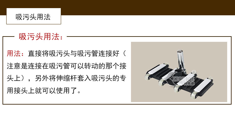 直接將吸污頭與吸污管連接好(注意是連接在吸污管可以轉(zhuǎn)動的那個接頭上),另外將伸縮桿套入吸污頭的接頭上就可以使用了。