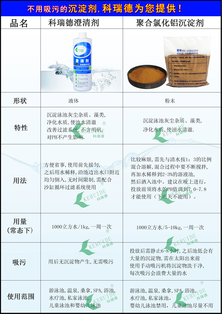 ? ? ? ?科瑞德澄清劑是一種濃縮的溶于水的DMDAAC聚合物,帶有正電荷,所以是陽離子澄清劑,很容易和泳池、溫泉及各種桑拿水療池水中帶有負(fù)電荷的懸浮顆粒結(jié)合,然后通過傳統(tǒng)的泳池過濾系統(tǒng)將懸浮物過濾掉,讓水變得清澈湛藍(lán)!它不含明礬,對PH不產(chǎn)生影響,使用方便,無需稱量無需提前溶解,無時(shí)間限制,直接沿著出水口附近均勻倒入即可,用后無沉淀物產(chǎn)生,無需吸污,能節(jié)省大量的水資源。