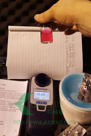 在晚上收?qǐng)龊螅?1:15),先投入氯粉使用得池水余氯超過5.0mg/L(約8.0mg/L),消毒粉大約加了20KG(圖2數(shù)據(jù))。